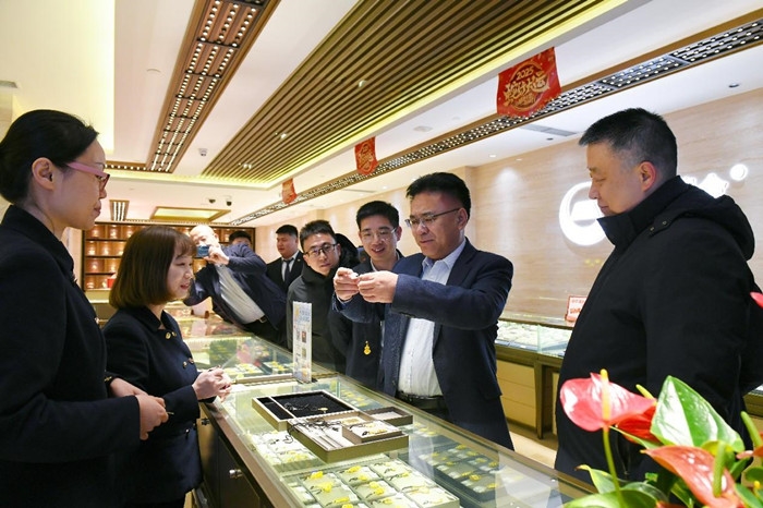 随后,周洲前往中国黄金北京旗舰店,详细了解了店面节日期间排班值班、经营销售和店面安全情况,高度赞扬了以中国黄金北京旗舰店为代表的一线职工节日期间坚守岗位、舍小家为大家的爱岗敬业精神。