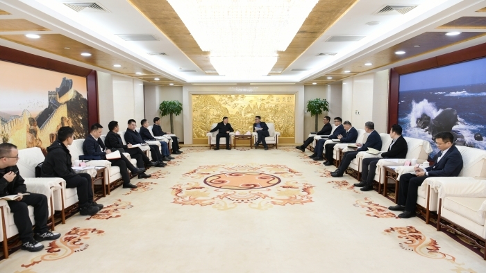 3月18日,中国黄金集团有限公司党委书记、董事长周洲在京会见贵州省政府副秘书长、省政府驻北京办事处党组书记、主任于毅一行。双方围绕加强央地合作展开深入交流,共商发展新路径,推动贵州黄金产业高质量发展。
