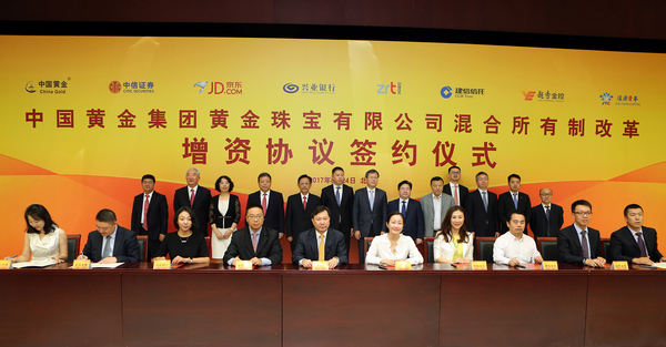 2017年8月24日,中国黄金集团有限公司控股公司中国黄金集团黄金珠宝有限公司与中信证券、京东、兴业银行、中融信托、建信信托、越秀产投、浚源资本七家战略投资方、产业投资方彩凤金鑫和持股员工代表举行混合所有制改革增资协议签约仪式。黄金珠宝行业国家队“中国黄金”旗下中金珠宝混合所有制改革成功落地。