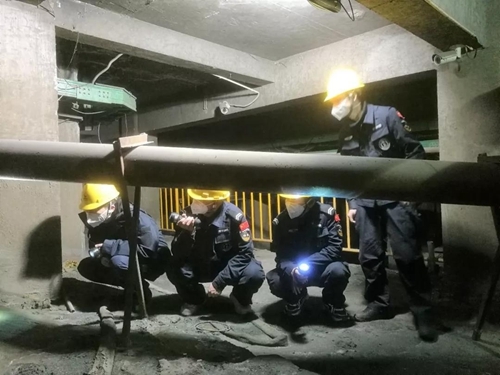 ▲值班队员对公司选厂车间磨浮工段2740球磨机精矿沙管道进行仔细检查。