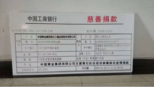 1月30日,中国黄金集团有限公司委托其在湖北的骨干企业——湖北三鑫金铜股份有限公司向所在地黄石市慈善总会捐赠300万元,用于黄石市采购防疫抗疫急需物资、慰问一线医护人员,尽己绵薄之力,与湖北人民一起,共克时艰、力抗疫情。据了解,这是目前为止黄石市慈善总会本级平台收到的最大一笔捐款。