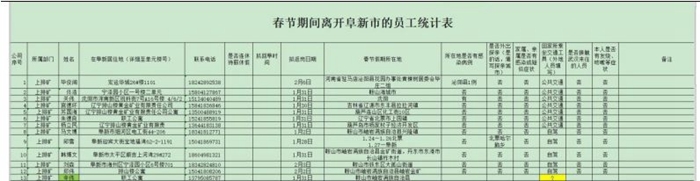 精细统计人员信息,排查春节期间出行情况,对统计出的春节期间离阜人员进行严格把控,要求返岗前进行申报,写明详细出行行程,并按要求到阜后主动自我隔离14日,无症状后才可上岗,防止潜伏期交叉传染。目前,未发现存在与武汉人员接触史的员工。