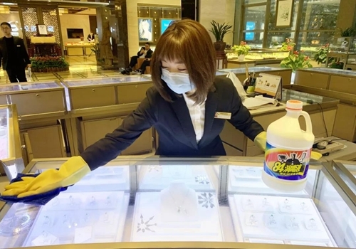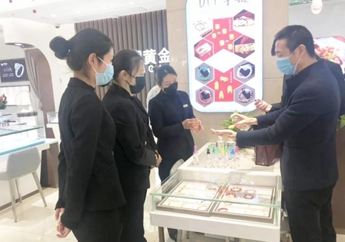 作为黄金为民的重要窗口单位,节日期间中金珠宝所属销售门店仍坚持开门营业,为广大消费者送去新春祝福,最大限度满足市场需要,很多一线员工也在加班加点,坚守岗位。对此,中金珠宝党委要求,目前正在营业的店面,在做好日常安全检查的同时,一定做好店面卫生消毒和人员健康状况检查,同时根据疫情发展形势缩短营业时间,减少在岗人员,并建立店面“日报”制度,确保信息畅通、群防群控。各店面要求员工统一戴好口罩,配合门卫做好登记、测体温,进入指定工作区域,严格按照排班表经店面大门进入,每天实时监测上报防控疫情领导小组,做好店面测体温消毒等防护工作。