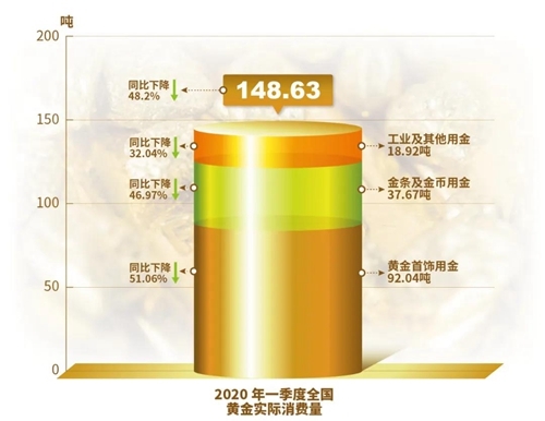 黄金消费方面 2020年一季度,全国黄金实际消费量148.63吨,与2019年同期相比下降48.2%。其中,黄金首饰92.04吨,同比下降51.06%;金条及金币37.67吨,同比下降46.97%;工业及其他18.92吨,同比下降32.04%。究其背后原因,新冠肺炎疫情暴发以来,全国采取严格的防控措施,叠加金价上涨因素,黄金首饰和金条消费均受到较大影响。由于春节前首饰零售企业按惯例进行囤货,以及国外疫情蔓延导致出口订单无法交付,黄金首饰加工企业虽然陆续复工,但加工订单量少难以实现完全复产。疫情期间,不少零售企业开展多形式线上营销,黄金首饰线上销量、金币等部分投资品类销量实现增长,但依然无法弥补店铺销量的下滑。此外,金价的上涨还导致黄金首饰和金条的回购量大幅增加。