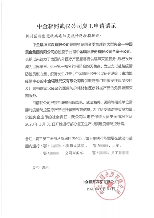 “目前我公司已接到联勤保障部队、武汉海关、医院等相关单位需要对疫情防控医疗产品进行辐照灭菌信息,为了给疫情防控贡献力量,承担央企应尽的社会责任,我公司决定在保证人员安全情况下,从2020年1月31日开始,进行部分复工生产,以满足疫情防控所需。”